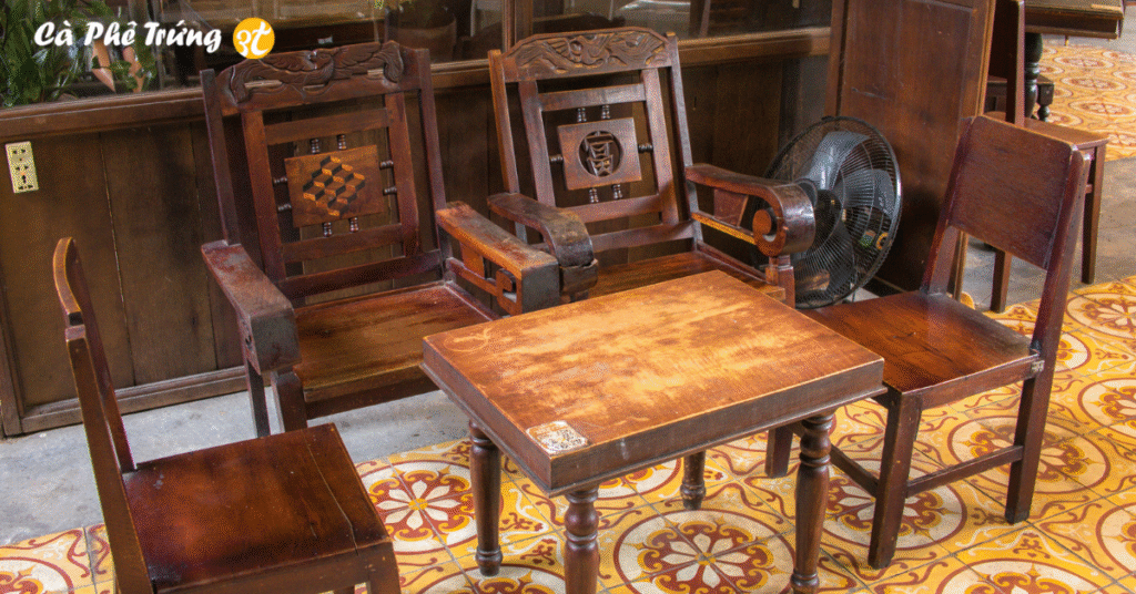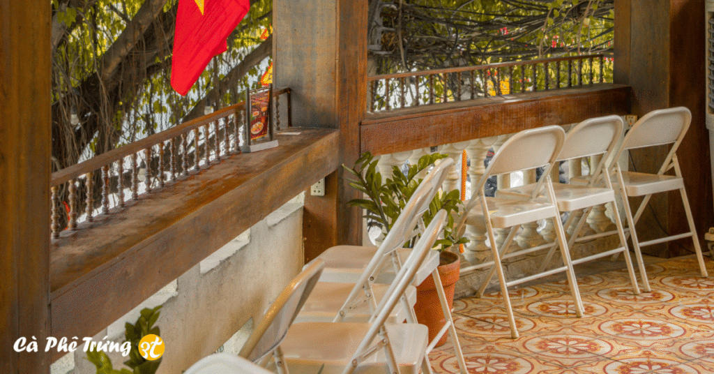 Trong ánh nắng sớm hắt lên mái ngói đỏ, bước qua khung cửa gỗ là cả một không gian mang dáng dấp Sài Gòn thập niên 60–70. Tường vàng, bàn ghế gỗ hoài niệm, cùng với hương cà phê trứng béo ngậy phảng phất trong không gian. Ngoài hiên, góc phố bờ kè vẫn tấp nập người qua, vang lên tiếng trò chuyện rộn ràng, gợi lại hình ảnh những quán cà phê “cóc” quen thuộc – cái nét sinh hoạt bình dị đã trở thành một phần ký ức của người Sài Gòn. Tất cả hòa lại thành một bức tranh đậm dấu ấn văn hóa, nơi nhịp sống đô thị và nét xưa hòa vào nhau tự nhiên, dung dị.