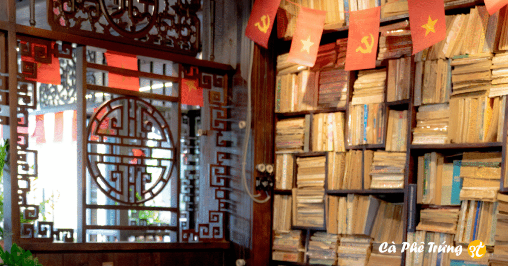 Bước vào bên trong, chiếc kệ gốm Bát Tràng là điểm dừng ánh mắt đầu tiên. Những ấm trà, chén nhỏ mang sắc men trầm ấm, mộc mạc mà tinh xảo, như kể lại câu chuyện của bàn tay người nghệ nhân, cùng với sự kiên nhẫn để tạo nên vẻ đẹp truyền thống. Khi bạn tiến sâu vào không gian này sẽ bắt gặp tường cũ lớn – thứ gợi nhớ về những hiệu sách, chợ sách xưa của Sài Gòn. Nơi từng trang giấy ố màu vẫn còn phảng phất mùi thời gian và cảm giác háo hức của người yêu sách thuở trước.