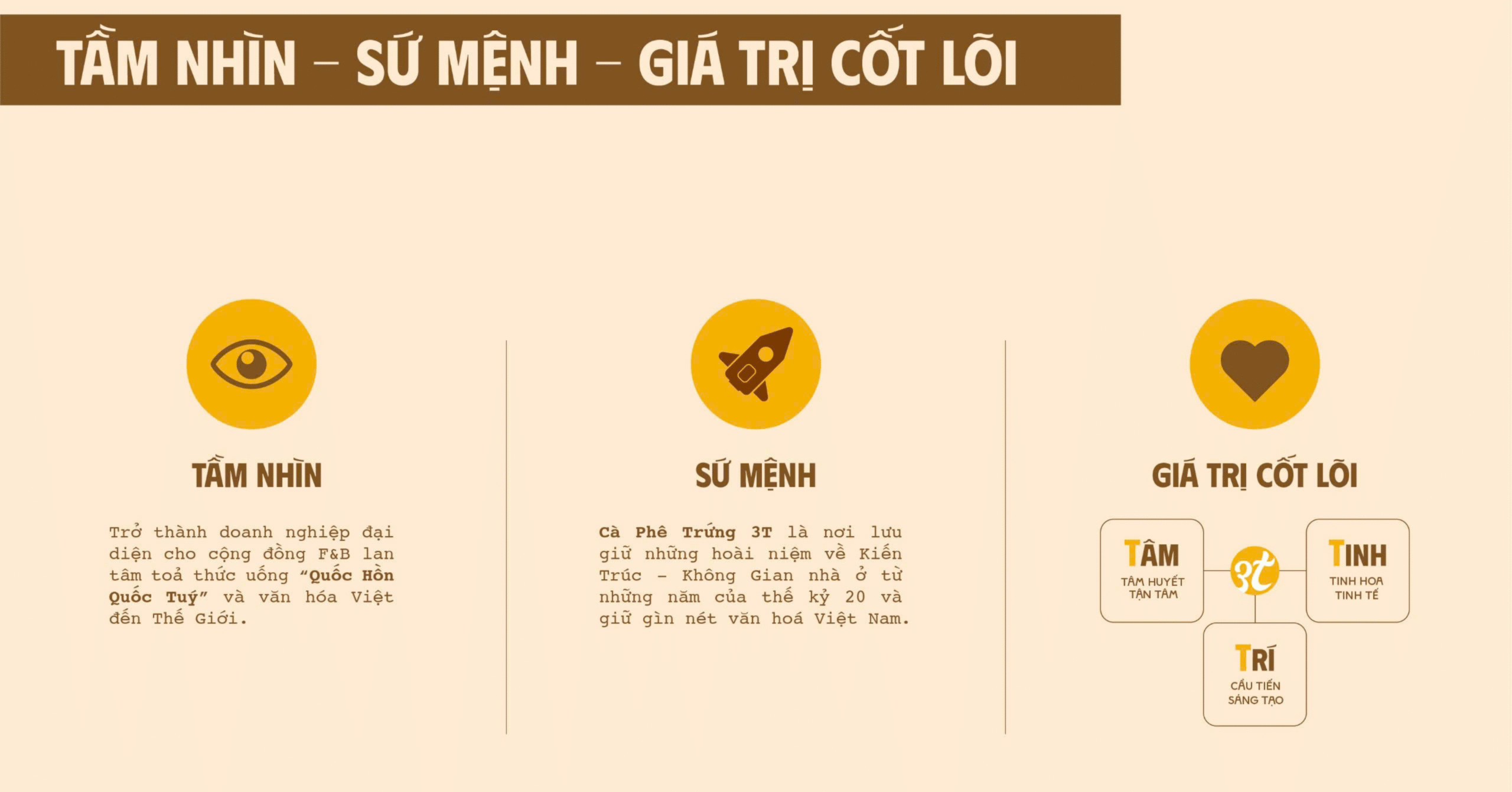 Cà Phê Trứng 3T là một không gian để khách hàng cảm nhận và chảy trong mình chất Việt đậm đà. Bởi tại một không gian xưa, bạn được thưởng – thức uống đặc sản. Hãy cùng 3T khám phá sứ mệnh, tầm nhìn và triết lý cốt lõi đã xây dựng nên một thương hiệu Cà Phê Trứng đầy cảm hứng.