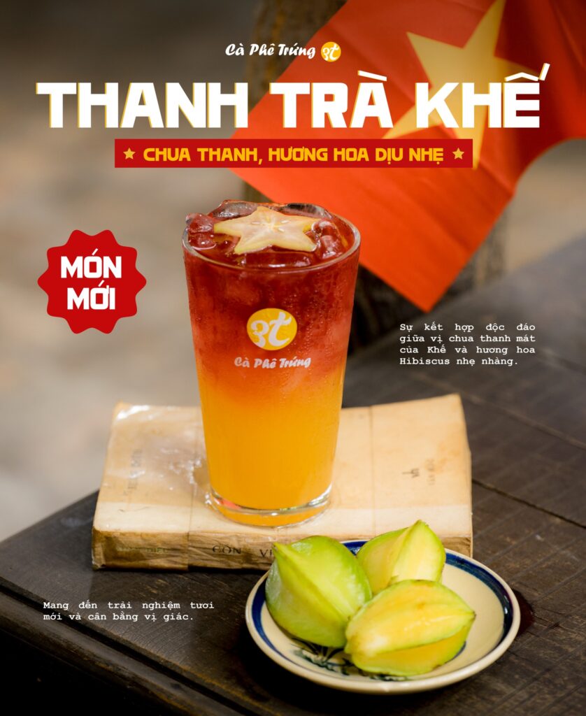 Những ngày thu tháng Tám, sắc cờ đỏ sao vàng tung bay khắp phố phường, gợi nhắc niềm tự hào và ký ức lịch sử của dân tộc. Từ cảm hứng ấy, Cà Phê Trứng 3T giới thiệu Thanh Trà Khế, phiên bản đặc biệt mang sắc cờ rực rỡ, điểm xuyết hương hoa dịu nhẹ như một lời chào mừng Đại lễ Quốc Khánh 2/9.